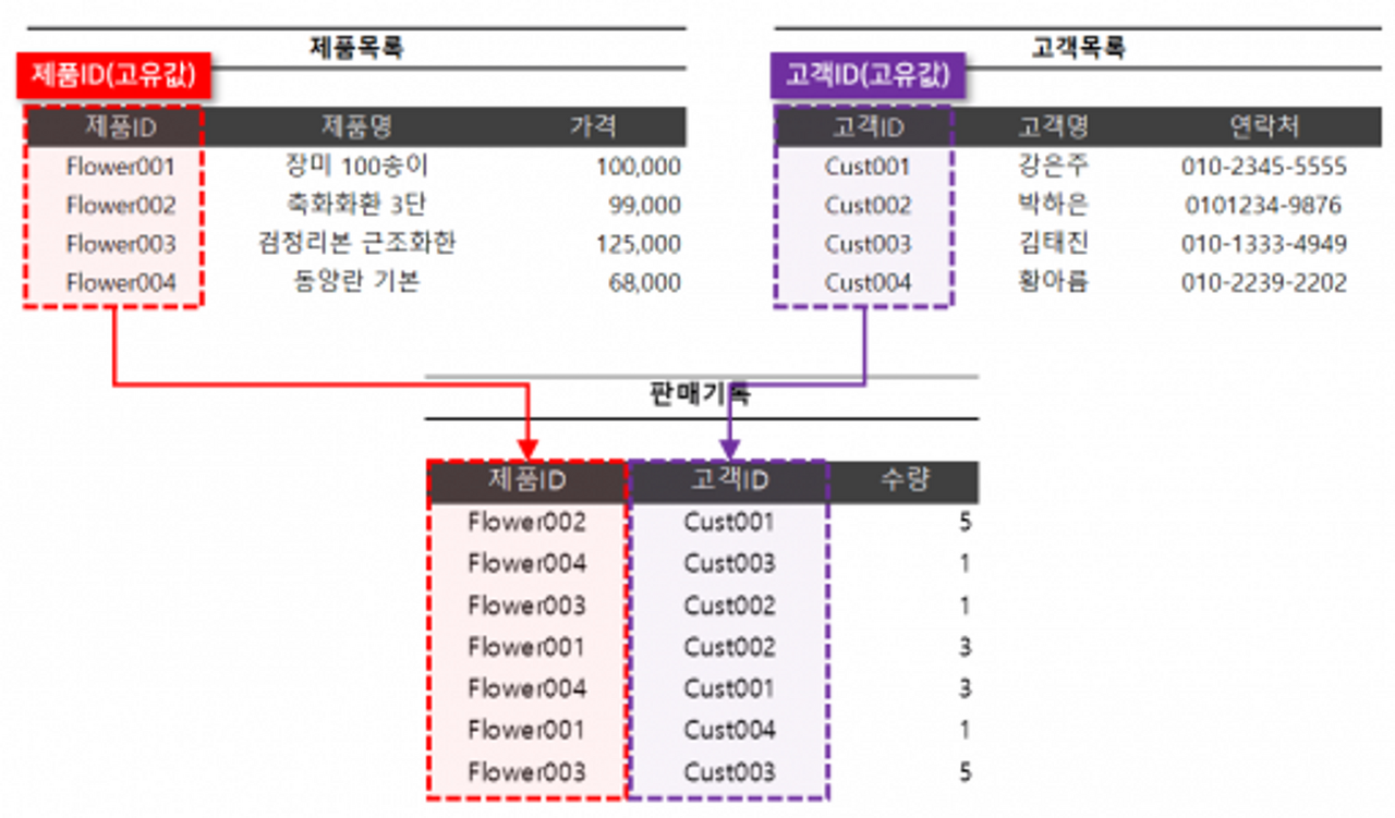 행과 열로 이루어진 각각의 테이블을 고유값(Primary Key)을 참조하여 서로 종속되는 관계(=연결하는것)를 표현할 수 있다.