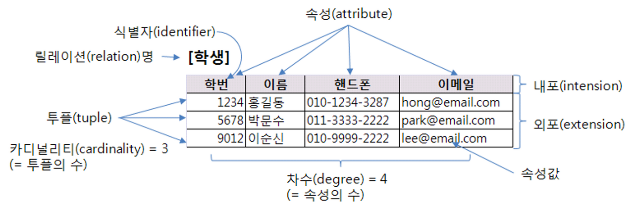 - 릴레이션(Relation) : 가로와 세로로 이루어진 테이블(표) 형태의 2차원 데이터